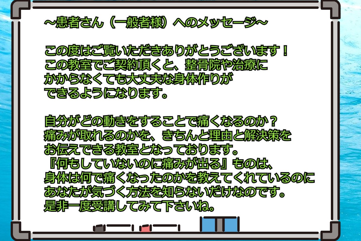初めまして澤地と申します。ここでは、何故人間の骨が歪まなくてはならないのか?について、原因と理由と対処法を詳しく説明する教室になっております。患者さん(一般利用者)の方は症状をまず、私に説明を頂ければかと思います。それに応じてどうしたらよいか?の対策をお伝えできればかと思います。